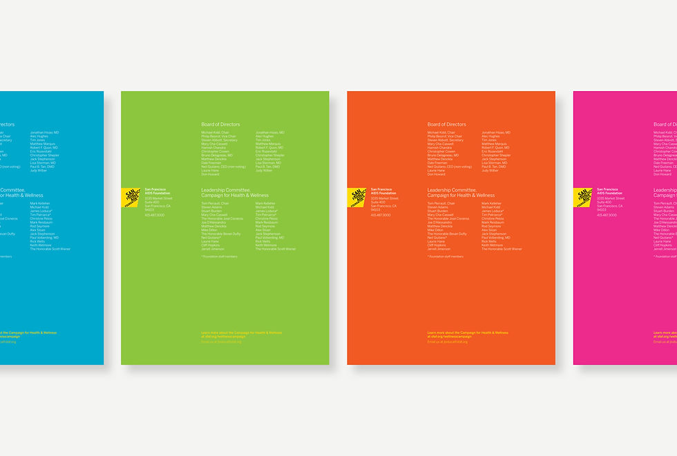The brochure highlights the foundation’s plan and puts a face to the people it helps. Four different covers show the diversity that make up the community. San Francisco men’s portraits and stories take you through the plan and connect donors to the human story.